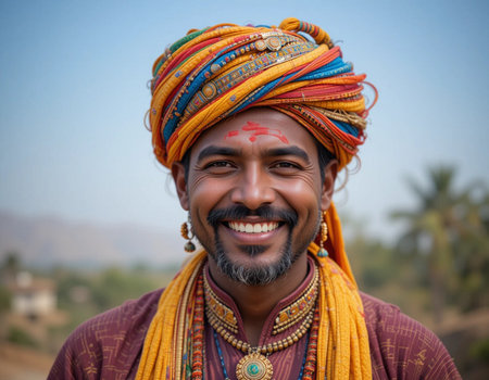 Young Indian man in traditional clothes and colorful headscarf smiling at camera.