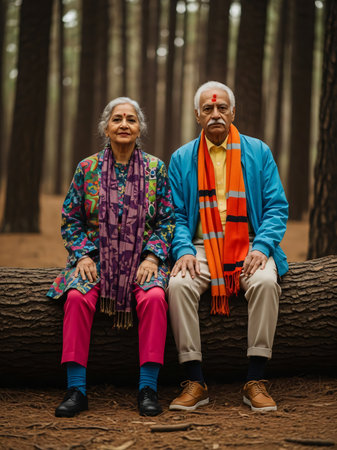 Smiling Elderly Couple in Traditional Attire Posing Outdoors During a Sunny Day.