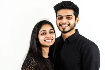 A young Indian Couple stand together, both wearing black shirts. The woman has long dark hair and is positioned on the left side of the image, while the man has short dark hair and is on the right. They are both smiling and looking directly at the camera.