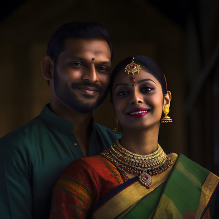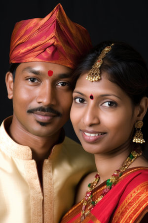 An AI generated illustration of a cheerful indian couple is wearing colorful traditional clothing and posing for a portrait