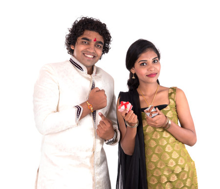 Indian couple is Celebrating Diwali. Isolated on decorative background.