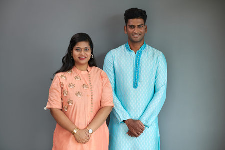 A Indian Couple standing side by side, both dressed in traditional Indian attire. The man wears a white shirt with a subtle pattern, while the woman is dressed in a vibrant yellow top adorned with intricate blue embroidery around the neckline. They stand against a solid blue background, which provides a striking contrast to their colorful clothing.