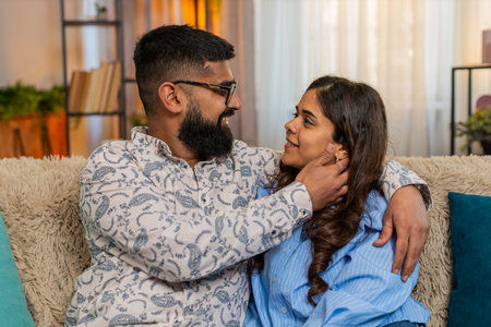 Indian couple man and woman sitting on home sofa, boy gently touching girls face while both look into each others eyes with love. Young family sharing emotional intimate moment full of tenderness