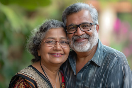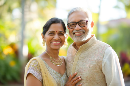 Smiling and happy senior Indian couple enjoys a leisure walk in the city park. They radiate happiness and warmth. This snapshot captures a moment of shared bliss during a vacation or holiday.