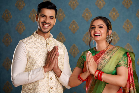 Portrait of a happy indian couple in traditional clothes, studio shot