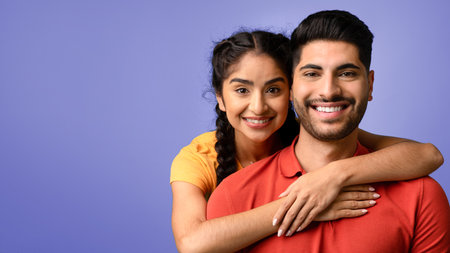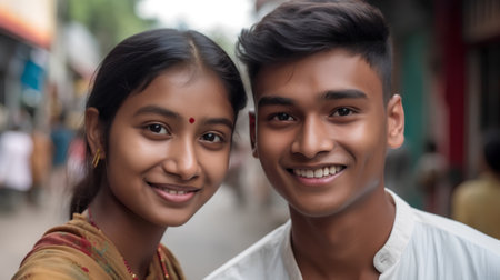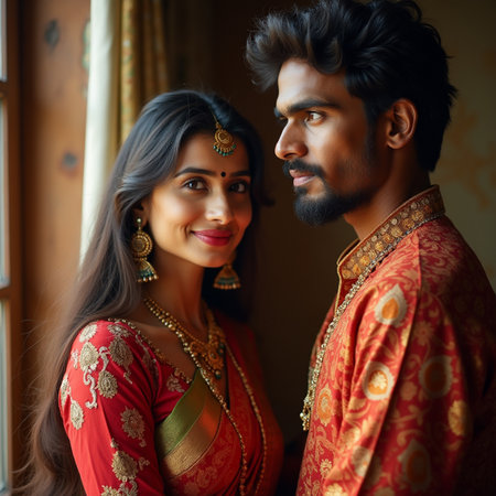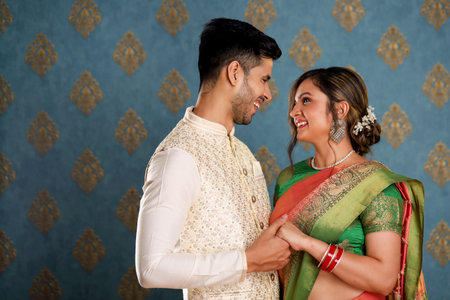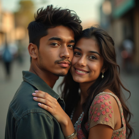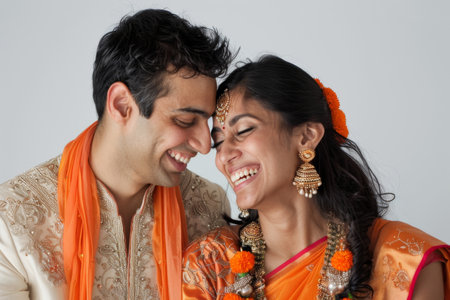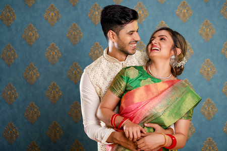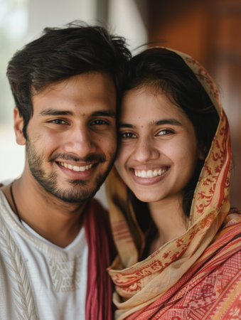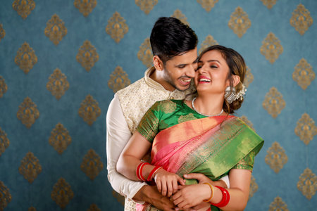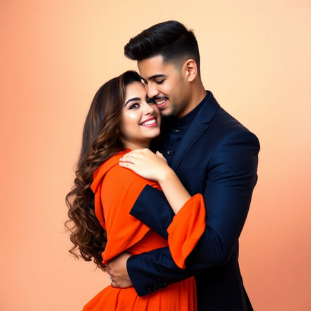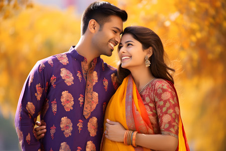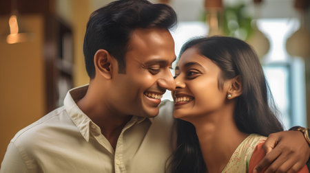 An affectionate Indian couple poses closely, their traditional Indian attire adding a touch of cultural elegance. Their smiles are a testament to their shared happiness and connection