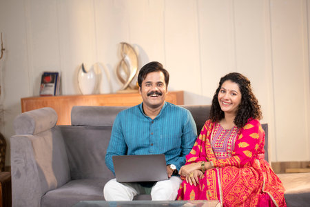 Indian couple using laptop and smiling while sitting on sofa in living room at home
