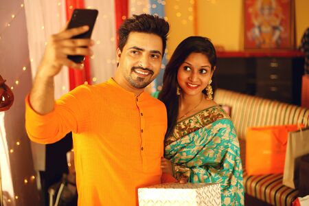 Beautiful Indian couple taking selfie using smartphone on studio background - concept of positive emotions and happy moments, relationship and bonding