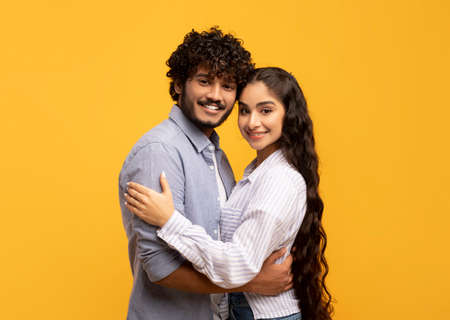Happy young indian spouses. Portrait of cheerful couple hugging and smiling at camera, standing over yellow background