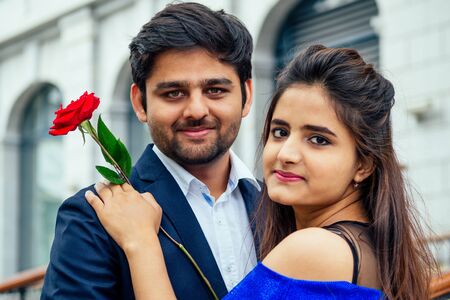 long haired brunette indian woman in blue dress with her handsome boyfriend having dating .man giving rose to his girlfriend in summer downtown street