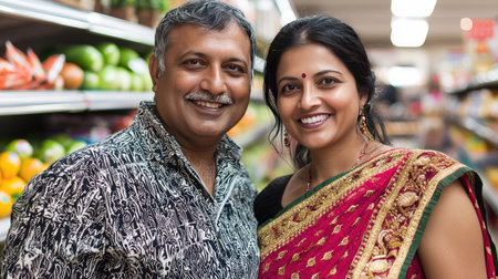 A joyful couple poses together in a vibrant grocery store filled with fresh produce. Their smiles reflect happiness and cultural connection in a lively market setting.