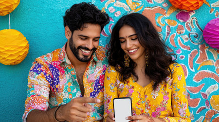 An elegant Indian couple in traditional festive clothing enjoying online shopping together on their smartphones during Diwali. A.I.