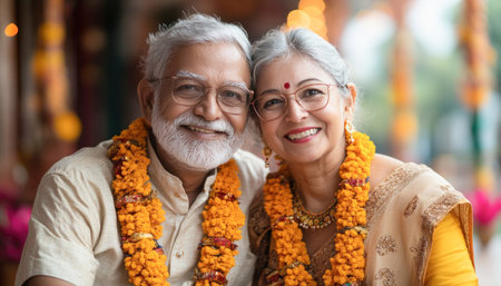 Happy indian senior couple wearing flower garlands smiling at diwali festival
