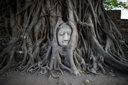 The Buddha head and face in the banyan tree's root in Wat Mahathat or Wat Maha temple in Ayutthaya Province, Bangkok City, Thailand. Famous Thai tourist attraction.