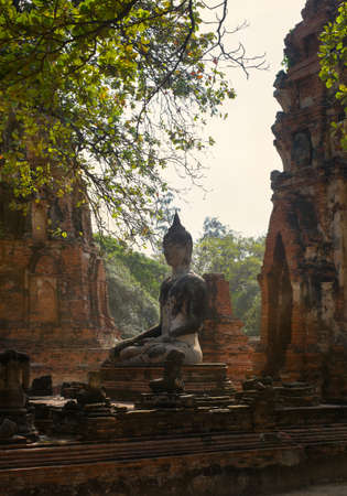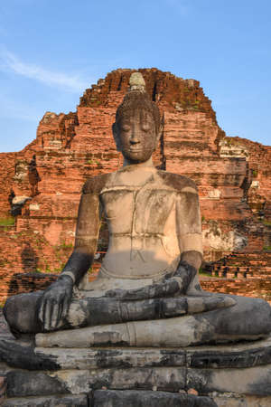 Ancient buddha statue at Wat Mahathat Buddhist temple, historic site in Ayutthaya, Thailand.