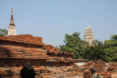 Overview of Ayutthaya temples in Thailand. Ruins of ancient brick walls, old pagoda.