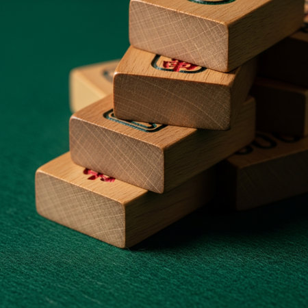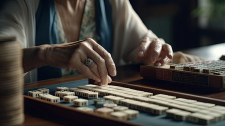 Group of People Engaging in a Strategic Game of Mahjong with Colorful Tiles on Wooden Table, Focus on Hands and Mahjong Pieces AI Generative