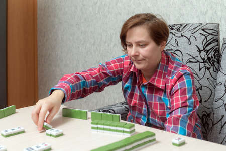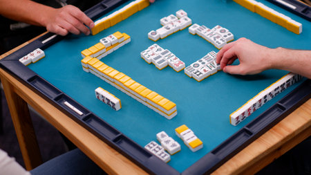 A mahjong table with an active game and the hands of a participant in the game. An ancient Asian game called Mahjong as a way to relax and have fun. Fragment of the game.
