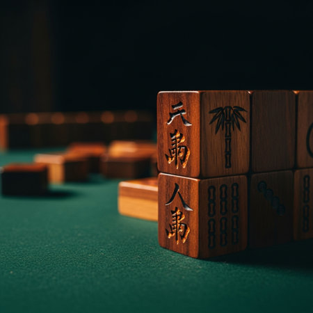 In the quiet glow of a vintage lantern, ancient mahjong tiles rest on a bed of dark, silken fabric.