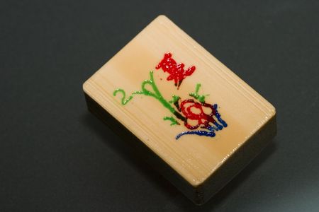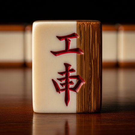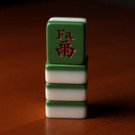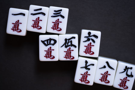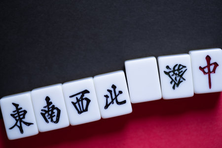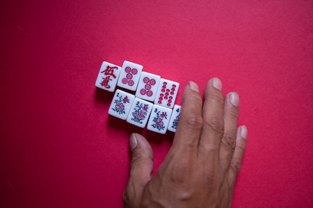 Close up of a hand holding a mahjong tile, a game of skill, strategy and calculation that originated in China. Traditional Chinese board game. Gambling and leisure.