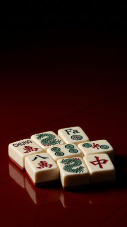 A vertical, tall 9:16 composition focusing on a cluster of antique bone and ivory Mahjong tiles (Red