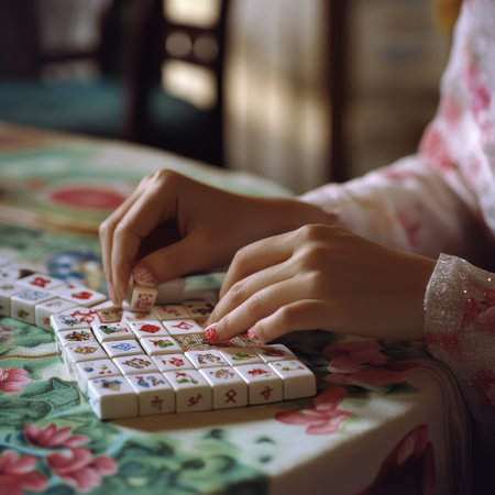 A hand is placing a mahjong tile in a row. This close-up shot shows the game pieces, highlighting the Chinese and Asian cultural tradition of the game.