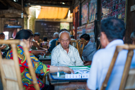 Chongzhou, Chengdu, Sichuan province, China - May 30, 2015 : Senior chinese people playing mahjong in an ancient tearoom