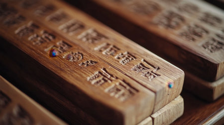 A close-up of the traditional Korean writing on wooden tablets, showcasing the rich history of Korean literature.
