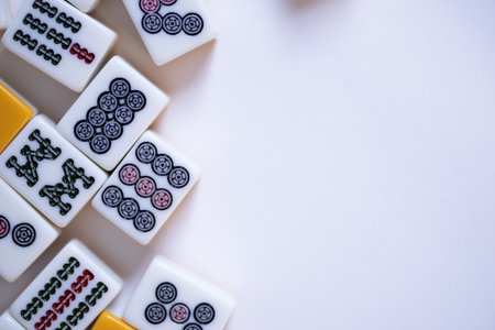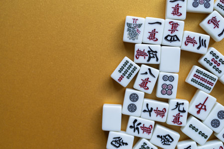 Mahjong. Riichi Mahjong set for playing. Space for text.