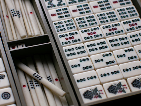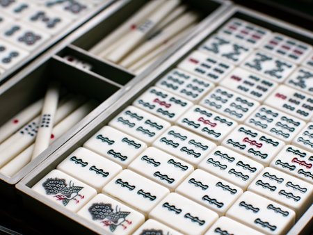 Traditional Mahjong Tiles Set with Circle Dots and Bamboo Sticks Arranged in Wooden Box
