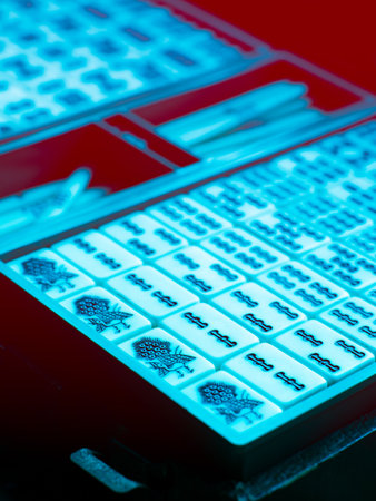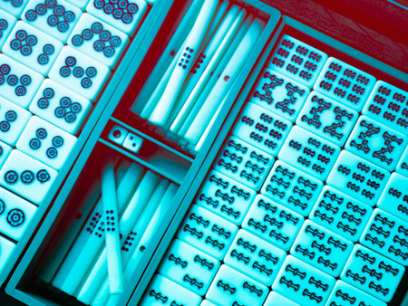 Chinese Mahjong Game Pieces Illuminated in Cyan Neon Lighting Showing Suo Bamboo Pattern