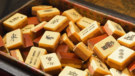 Vintage Bone and bamboo Mahjong or mah-jongg playing tiles in box. Close up Background.