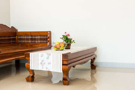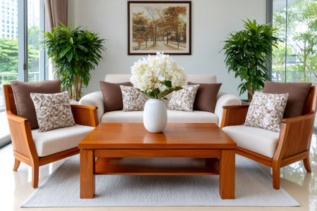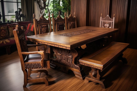 Vintage wooden furniture set with detailed carvings and comfortable cushions creates a warm atmosphere in a beautifully designed interior space