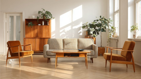 A beautifully arranged living room featuring vintage furniture, warm sunlight, and lush greenery creates an inviting atmosphere for comfort and relaxation.