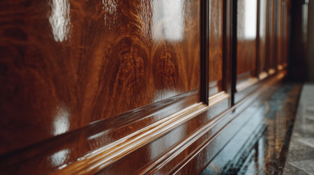A stunning close-up of luxurious wooden paneling showcasing rich textures and glossy finishes, creating a warm and inviting atmosphere in an elegant interior space.
