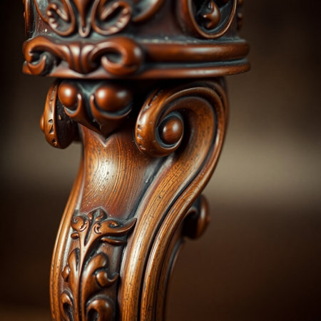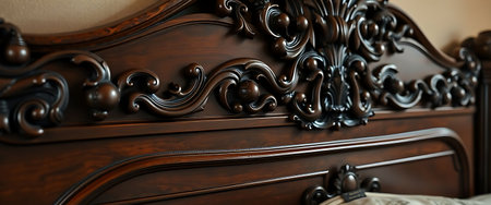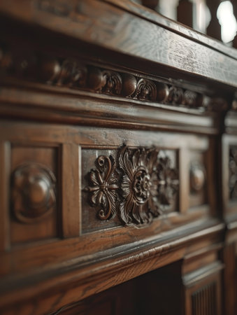 This image features exquisite carved woodwork on antique furniture, showcasing intricate designs and texture that embody classic elegance and craftsmanship.