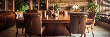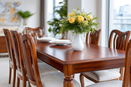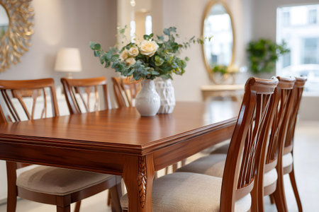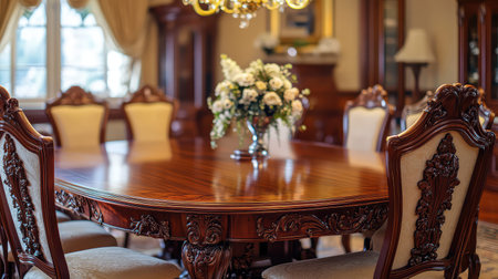 Elegant dining room interior with a polished wooden table, chairs, and fresh flowers
