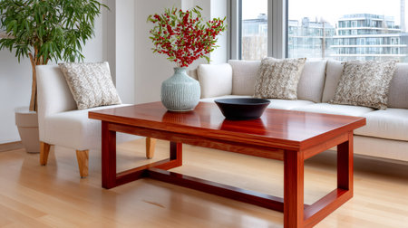 Modern living room interior featuring a wooden coffee table, couch, chair, and large window