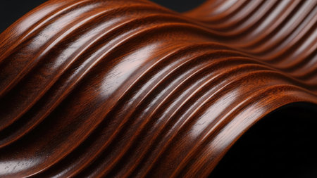 A close-up showcases a flowing, wave-like wooden structure with a rich, dark brown hue. The design features smooth, curved lines and a glossy finish, highlighting the natural grain. The composition suggests a studio setting with focused lighting. This image is suitable for various commercial uses related to design and textures.