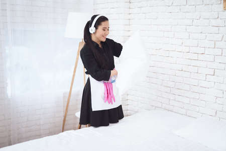 Young Asian maid dresses pillowcase on pillow.