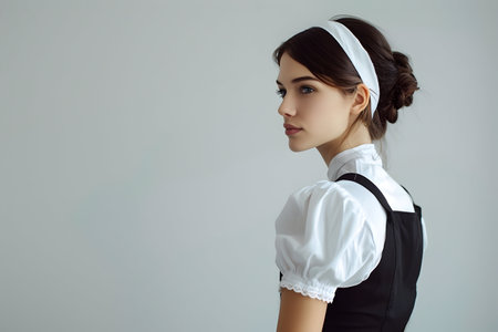 A graceful young woman in a classic maid outfit, showcasing elegance and poise in a minimalistic setting.