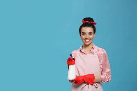 Young housewife with detergent on light blue background, space for text