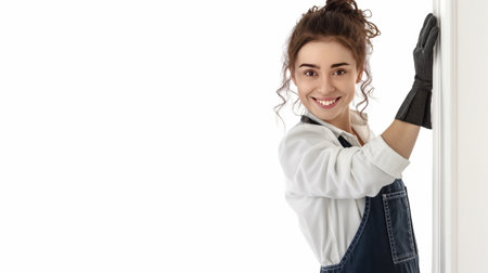 Young beautiful cleaning lady on a white background with its own place for your text. House or office cleaning concept.