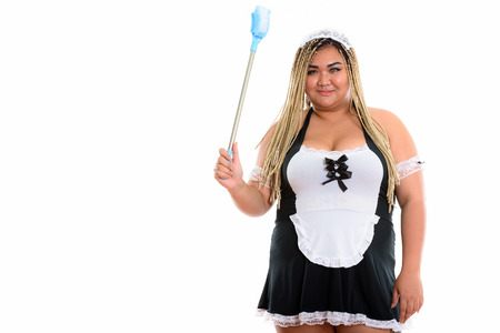 Fat Asian cleaning lady holding toilet brush while wearing sexy