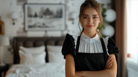 A young pretty girl maid smiling posing in a short apron in a hotel room next to the bed. AI generated.