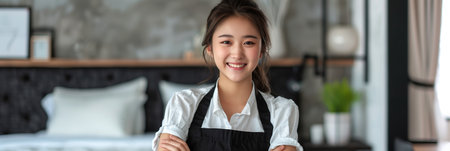 Asian woman wearing white shirt and apron, professional home cleaning service job