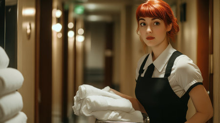 A red-haired housekeeping staff member carrying fresh linens walks through a hotel hallway, ensuring cleanliness and order during her shift. She appears focused on her task.