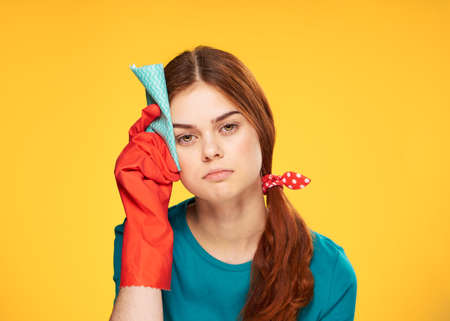emotional cleaning lady rubber gloves house cleaning yellow background