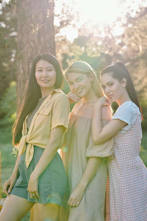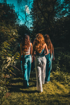 Three caucasian young long-haired women are walking on a forest path in beautiful summer afternoon light, they are seen from behind. Beautiful light reflections in her hair. Vertical.