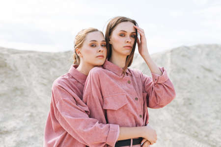 Fashion beauty portrait of young women sisters in brown organic velvet jeans shirts on the desert background